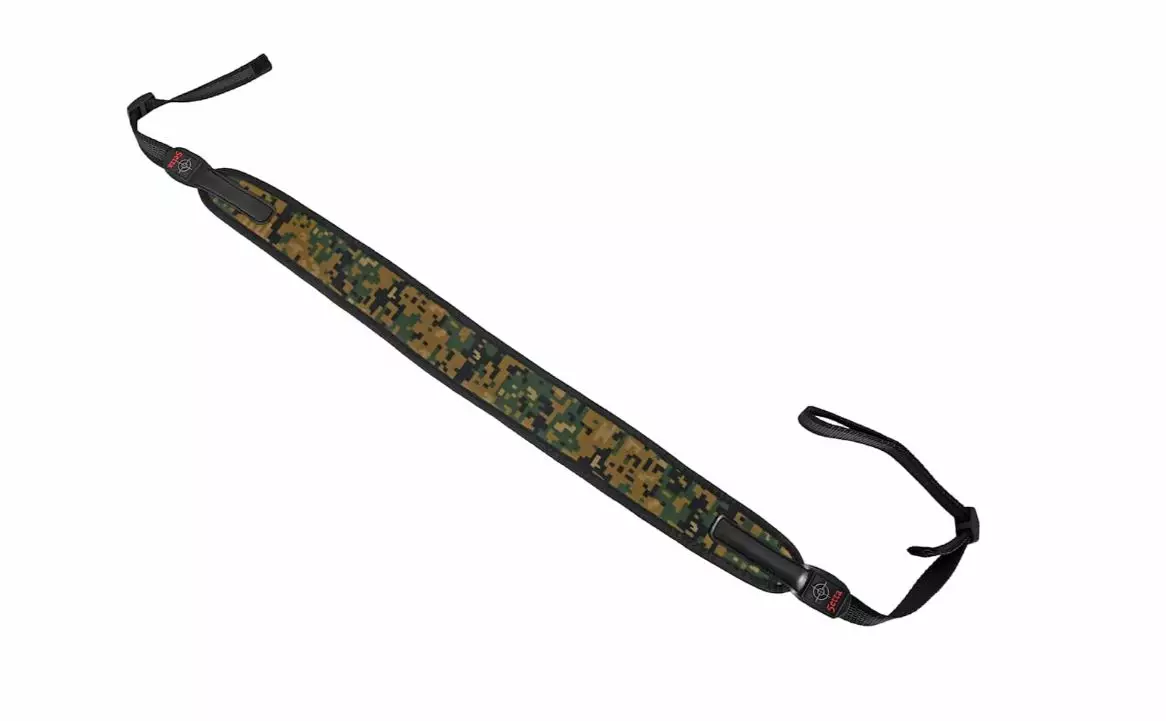 Neopreenista valmistettu asehihna camo pixel -kuvioinnilla, mukava ja helposti säädettävä. Sisäpinta on kumia, mikä estää hihnan valumisen olalta.