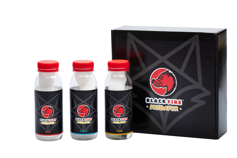 BlackFire Predator on erittäin tehokas houkutin monille pedoille kuten ketuille, mäyrille, supikoirille sekä Etelä-Euroopassa pesukarhuille ja sakaaleille. Houkuttimeen kuuluu erityinen imeytyssieni, jota voidaan käyttää houkutusaineen ja -hajun levittämiseen. Innovatiivisen pakkaussuunnittelun tuloksena houkutin säilyy voimakkaana huomattavasti pidempään kuin kilpailevien tuotteiden. Jokainen tuotepakkaus sisältää kolme pulloa, joiden erilaiset sisällöt lisäävät mahdollisuuksiasi päästä parhaisiin tuloksiin. Dr. Black Fire kehitti näitä hajuja lähes kaksi vuotta. Parhaiden hajujen kehittäminen oli pitkä prosessi, mutta teimme siinä paljon työtä, jotta sinun ei tarvitse tehdä sitä. Nyt sinun tarvitsee vain testata mikä hajuista toimii parhaiten sinun metsästysalueellasi ja siellä oleville pedoille. Niin helppoa se on!