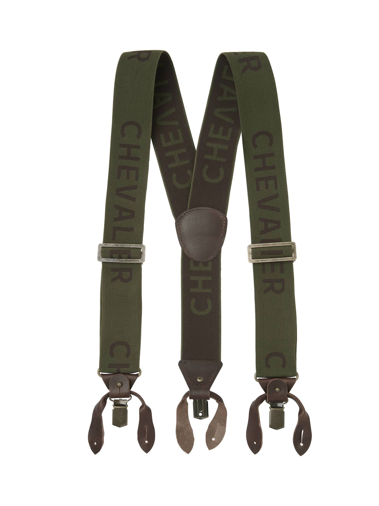 Leveät, säädettävät ja joustavat Chevalier Logo -henkselit. Leveistä henkseleistä löytyy sekä klipsi- että nappikiinnitys. Osana kestävän kehityksen työtä nahkaosat valmistetaan edellisen tuotannon jätteistä