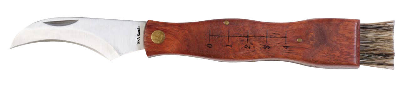 Puukahvainen sieniveitsi harjalla. Terän pituus 75mm.