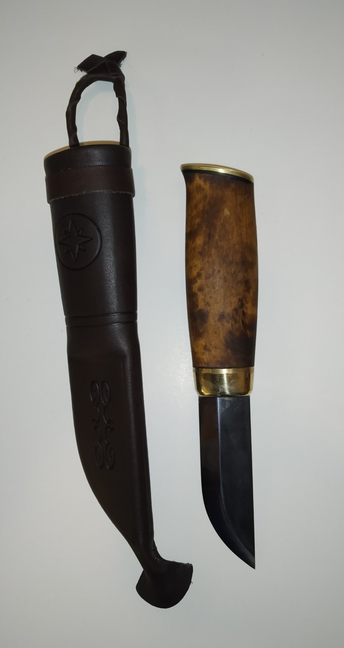 Eräpuun Hirvestäjä puukko 90mm hiiliteräs terällä ja petsatulla kahvalla.