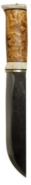 Nöyrästi pohjoismaisille leukuperinteille kumartava veitsi noudattelee materiaalivalinnoiltaan tyypillistä, suomalaista kaavaa: 21 senttiä pitkä terä on hiiliterästä ja miellyttävän ergonominen kahva visakoivua. Visakoivulle koristeellisuutta luo sekaan lisätty poronsarviluu. Tuppi on tietenkin vankkaa nahkaa.