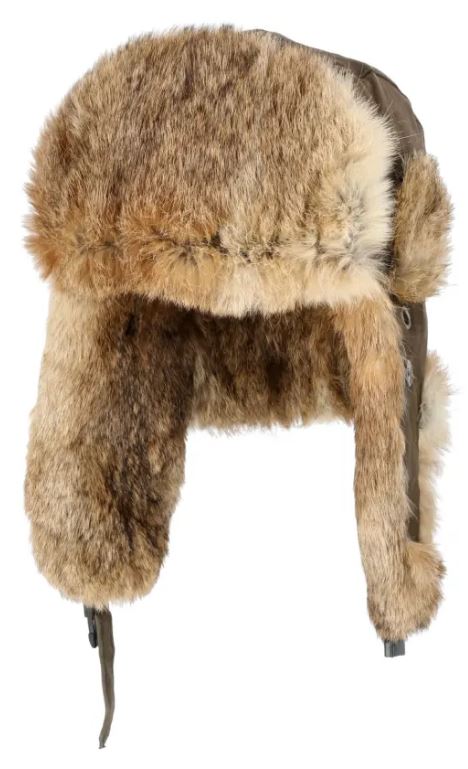 Todella lämmin karvahattu, Päällinen aitoa antiikkiruskeaa nappanahkaa, pehmeä kaninkarva lipassa, korvaläpissä ja niiden välisessä niskakappaleessa.