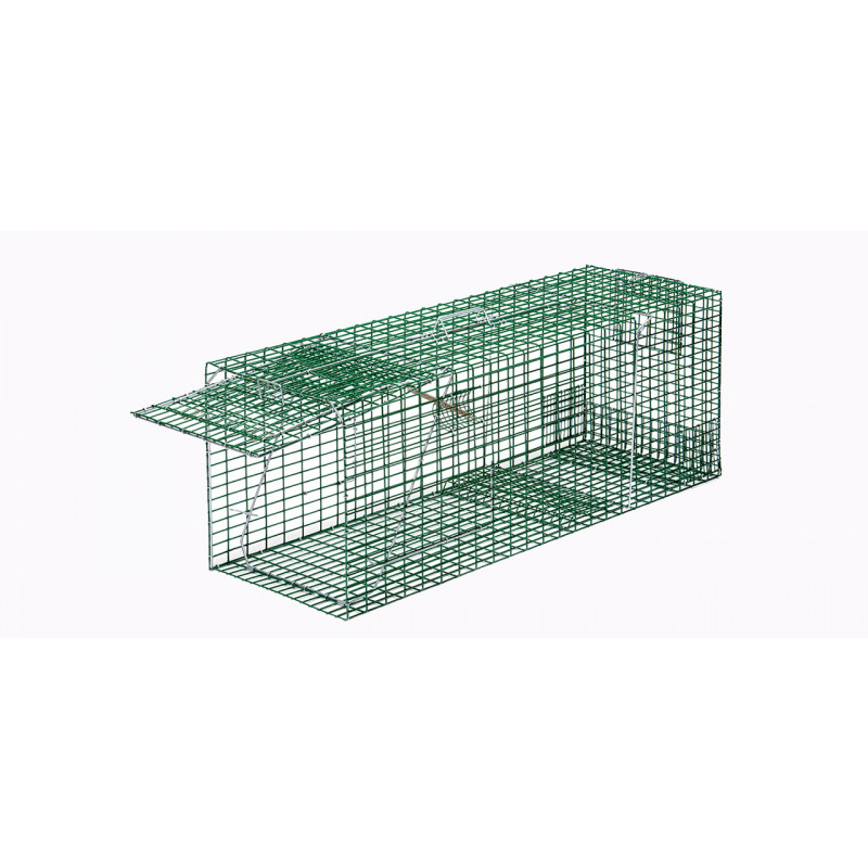 Viritä loukku avaamalla syöttiluukku ja aseta syötti lattialle loukun päässä. Irrota salpa molemmilta puolilta ja avaa luukku. Aseta loukun laukaisin luukussa olevan vastakappaleen alle. Loukku sulkeutuu, kun eläin astuu loukussa olevalle astimelle.