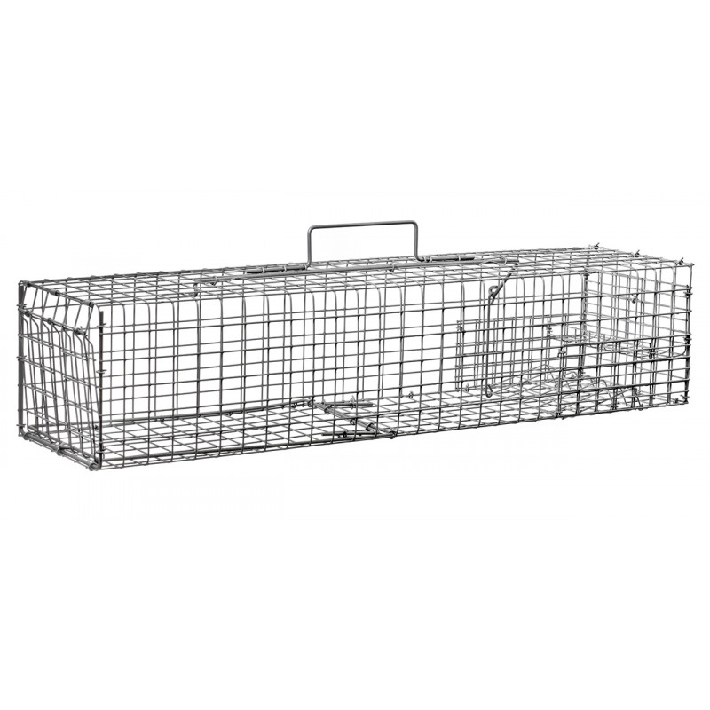 Viritä loukku vetämällä jousta ylöspäin ja käännä luukku sisäänpäin. Nosta astinlautaa kunnes koukku kiinnittyy luukkuun. Pidä loukku pystyssä ja pudota syötti ruokakuppiin. Ansa sulkeutuu, kun minkki astuu loukun sisällä olevalle astinlaudalle.