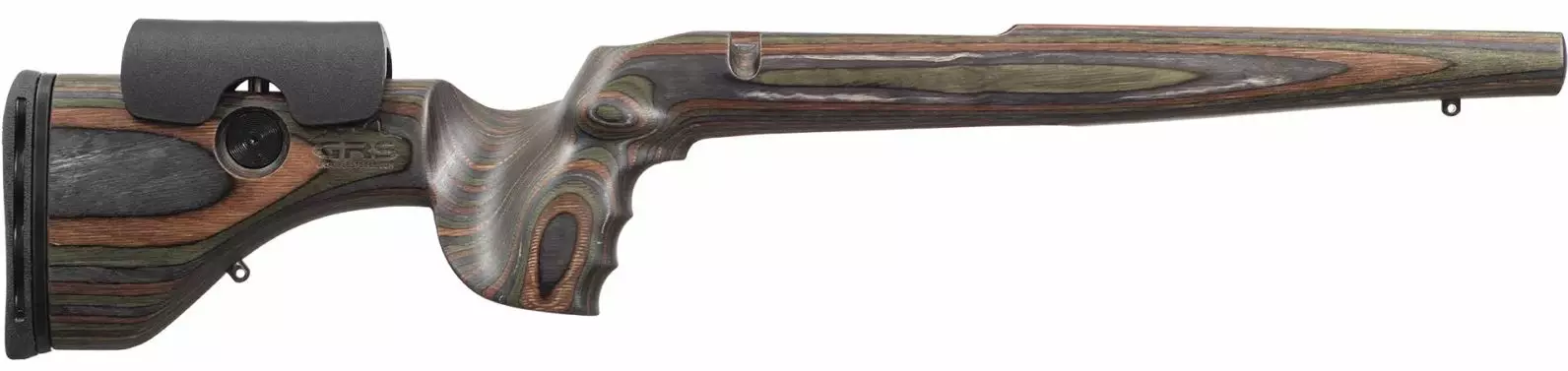 GRS Hunter Light -tukki Tikka T3, Green Mountain Camo. Metsästysmallin laminaattitukki poskipakan korkeussäädöllä ja kumisella perälevyllä. GRS Hunter Light -malli on 25%, eli n. 1 kilon, kevyempi kuin GRS Hunter-malli.