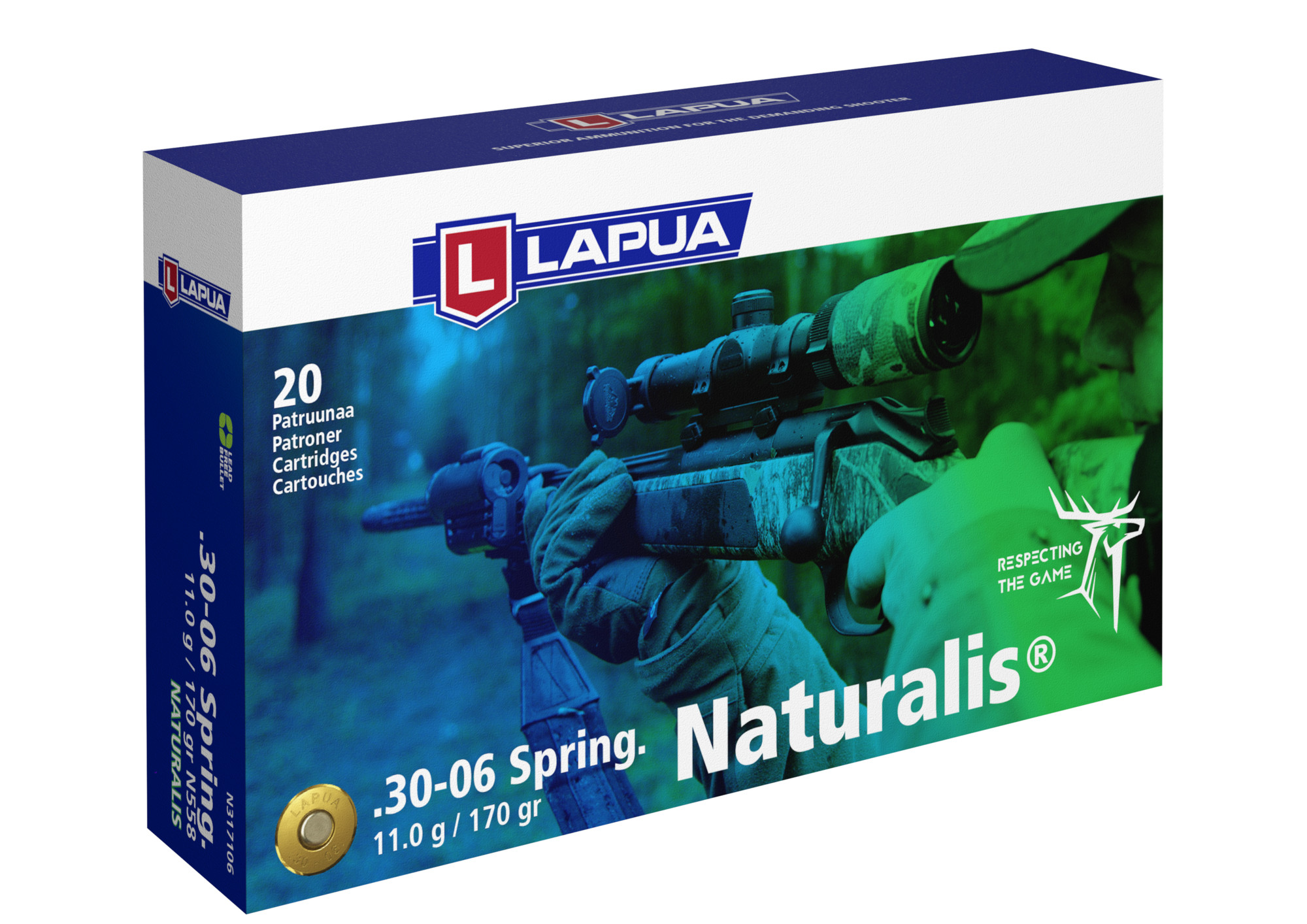 Lapua Naturalis .30-06 Spr -kiväärinpatruuna täyskuparisella, laajenevalla luodilla.Naturalis-luoti säilyttää tyypillisesti jopa 100% jäämäpainostaan, laajenee kaksinkertaiseksi alkuperäisestä läpimitastaan ja omaa hyvän tunkeuman. 20 kappaleen rasiassa.