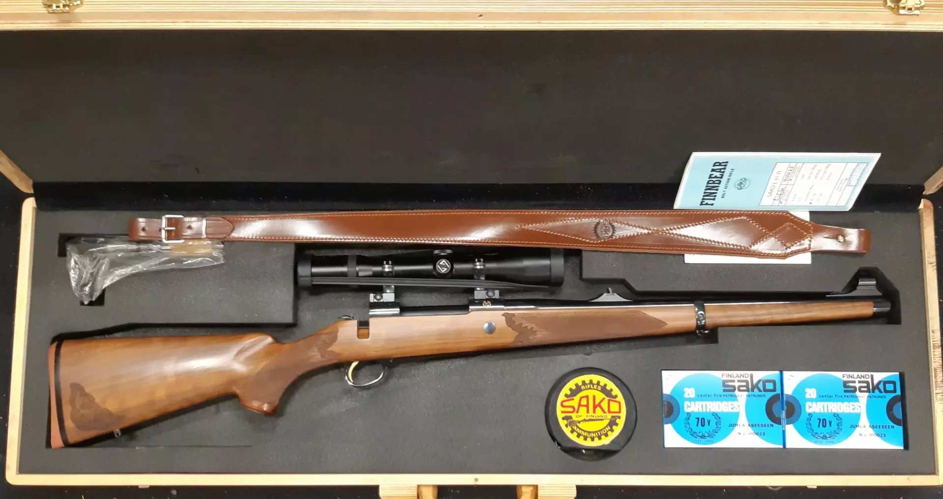 Sakon 70v juhla-ase Zeissin 1,5-6x42 kiikaritähtäimellä ja Sakon optilock kiikarinjaloilla. Ase on ampumaton ja toimitetaan alkuperäisessä puisessa visaviilusalkussa alkuperäisillä tarvikkeilla.