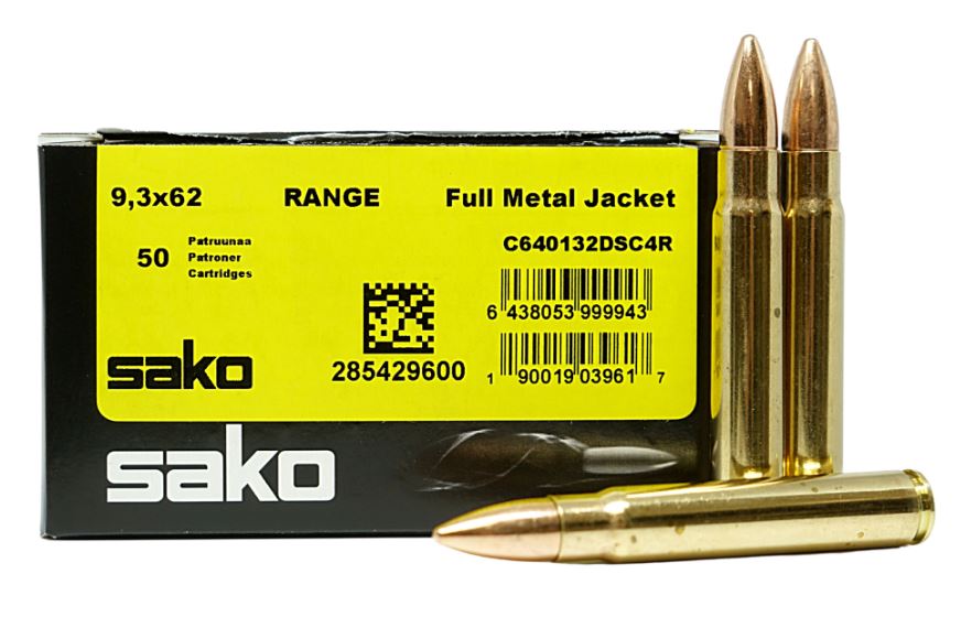 Sako Range 9,3x62 Tuotteen tiedot: Kaliiperi: 9,3x62 Paino: 15g / 231gr Luoti: FMJ Lähtönopeus: 750m/s Pakkauskoko: 50kpl/rs