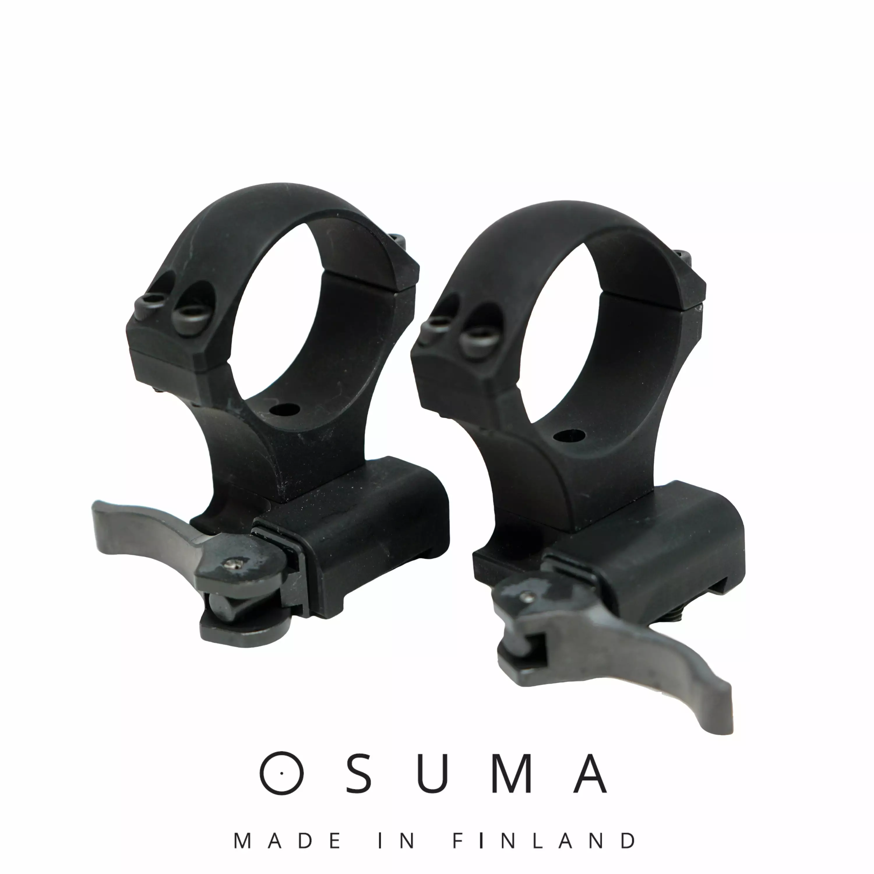 Pitkän kehitystyön tuloksena kehitetty pikajalka mallisto, joka todella toimii! Asentaminen onnistuu helposti ilman erityistaitoja tai työkaluja. Matala jalusta sopii kiikaritähtäimille, jossa 30mm runkoputki ja max. 56mm objektiivilinssin halkaisija. Medium renkaalla vapaa korkeus kiskon päältä runkoputken alapintaan 18,5mm. Sopii Tikka kivääreihin.