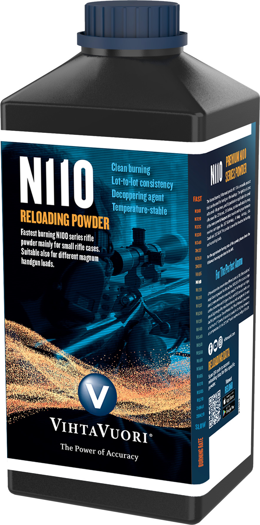 Nopein Vihtavuoren kivääriruudeista. N110 ruuti soveltuu hyvin pienien kiväärinpatruunoiden kuten .22 Hornetin ja .30