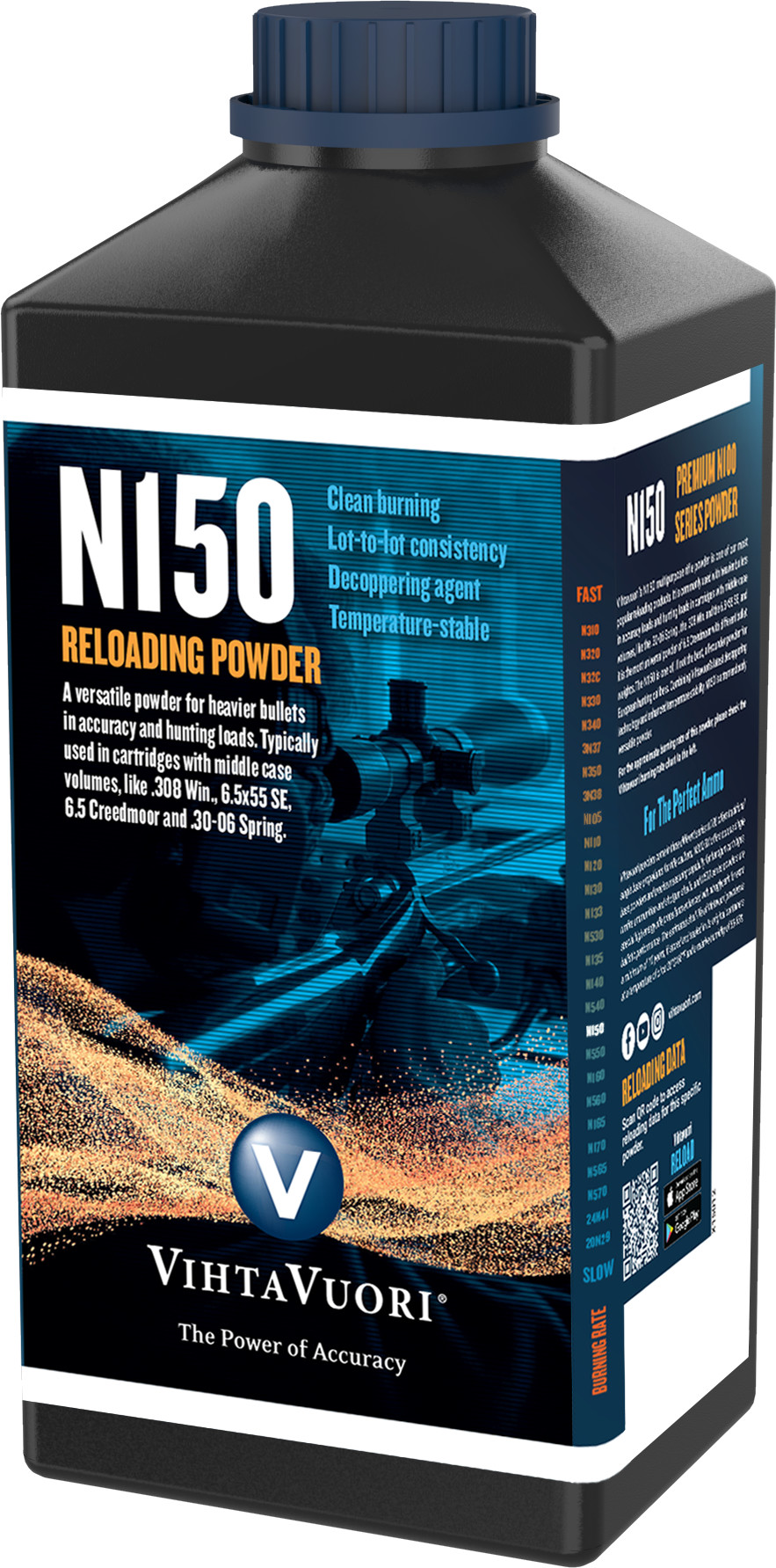 N140:tä hieman hitaampi ruuti, joka on omiaan esim. .308 Win., 6.5x55 SE ja .30-06 kaliiperien tarkkuus- ja